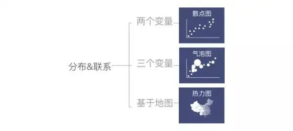 无论数据总量和复杂程度如何,数据间的关系大多可分为三类:比较/构成/分布&联系。