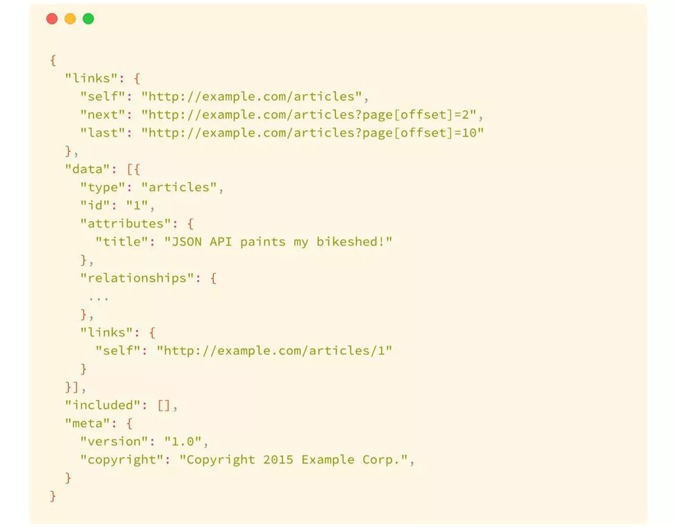同样的,这个世界上已经有人注意到这个问题,有一份叫做JSON API开源规范文档描述了如何传递数据的格式,JSON API最早来源于Ember Data(Ember是一个JavaScript前端框架,在框架中定义了一个通用的数据格式,后来被广泛认可)。