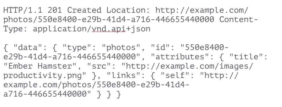 如果客户端发起一个POST请求,在RESTful部分我们提到,POST为创建资源,如果服务器处理成功应该返回一个创建成功的标志,在HTTP协议中,201为新建成功的状态。文档规定,服务器必须在data中返回id和type。 下面是一个HTTP的返回例子: