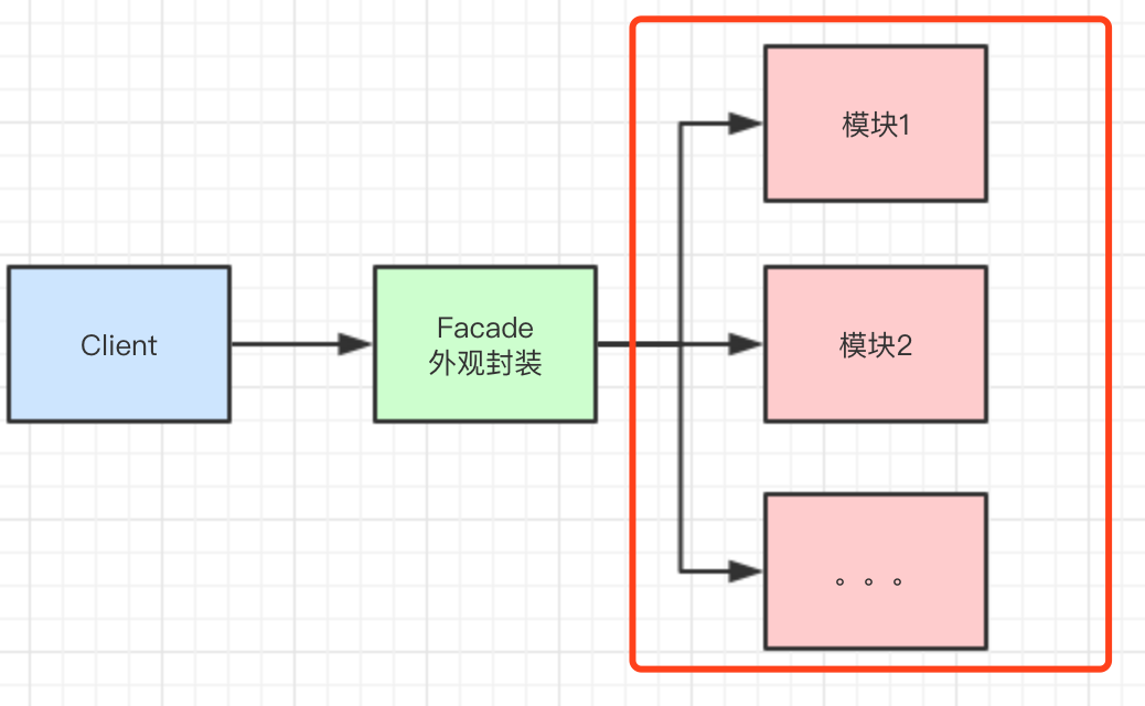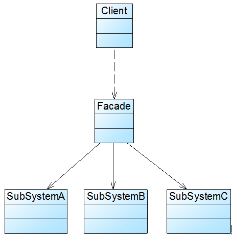 外观模式(Facade,门面模式), 为子系统中额外一组接口提供一个一致的界面,此模式定义了一个高层接口,这个接口使得这一子系统更加容易使用。
