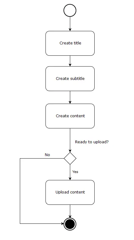 For instance, we can create an activity diagram to describe the steps needed to fulfill the “upload content” action. There is an example of this in sections 3 and 4.