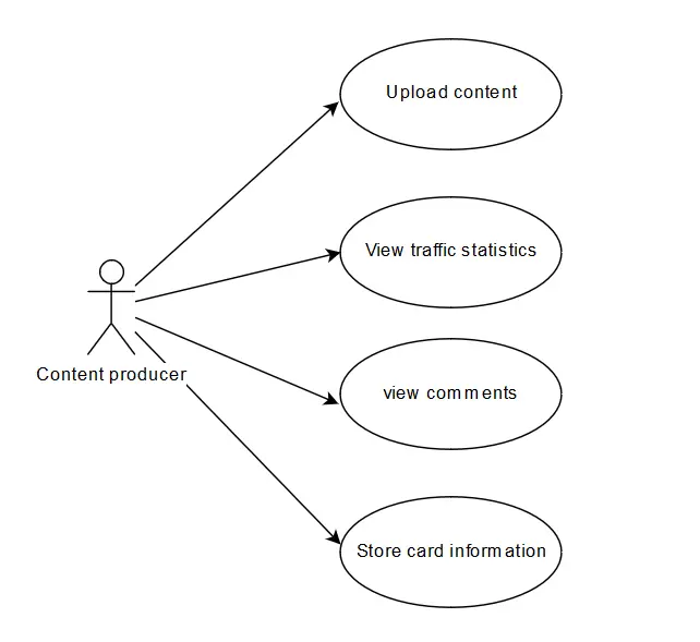 As shown above, the user is the content-producer and performs four actions. An action is a feature that needs to be implemented. The use case diagram does not describe the behavior of the app, except the interaction between the user and the app, or parts of it.