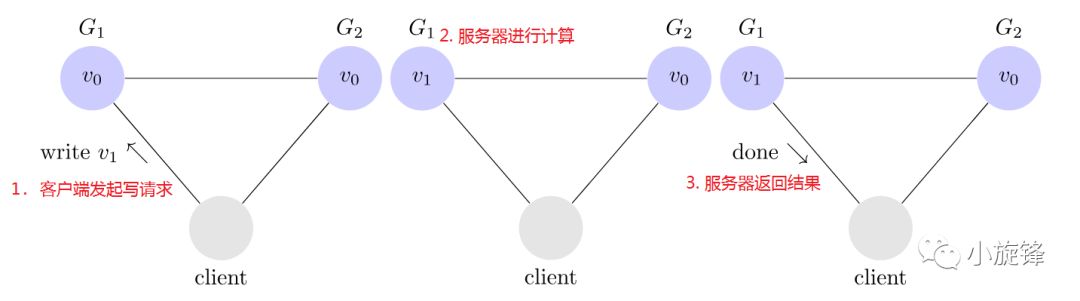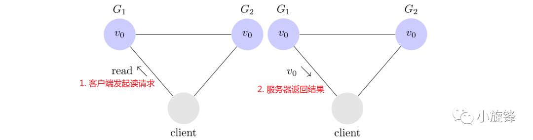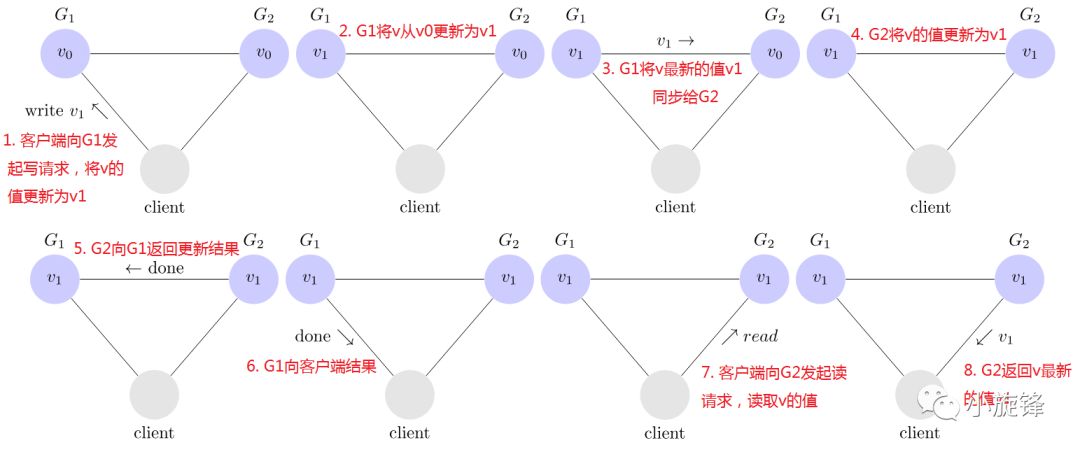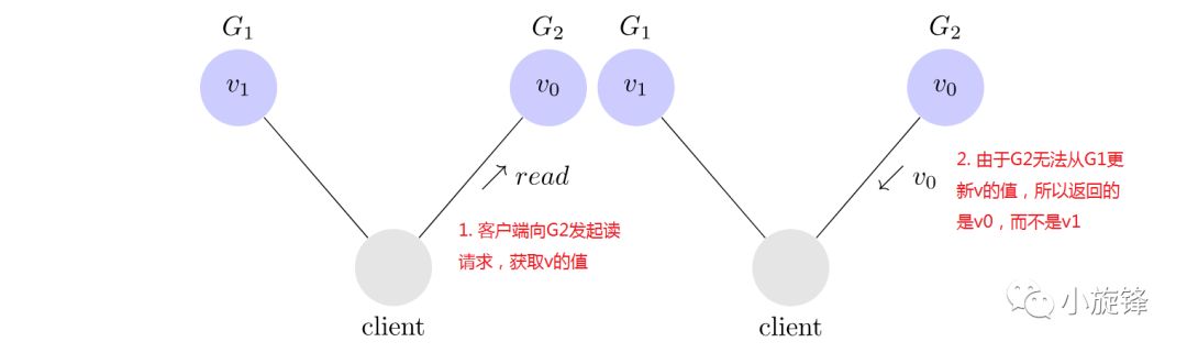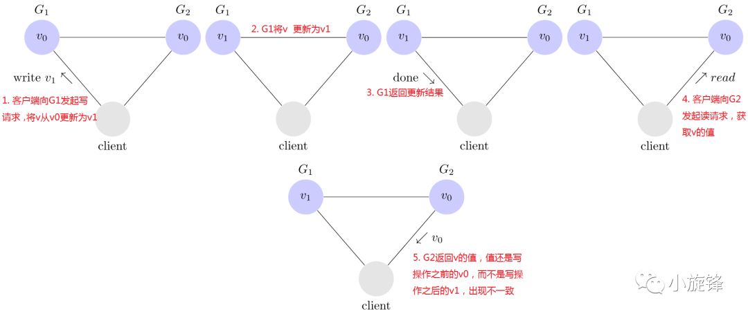 客户端向G1发起写请求,将v的值更新为v1且得到G1的确认响应;当向G2发起读v的请求时,读取到的却是旧的值 v0,与期待的v1不一致。