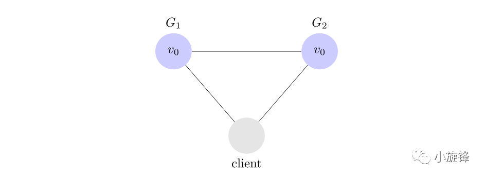 让我们来考虑一个非常简单的分布式系统,它由两台服务器G1和G2组成;这两台服务器都存储了同一个变量v, v的初始值为v0;G1和G2互相之间能够通信,并且也能与外部的客户端通信;我们的分布式系统的架构图如下图所示: