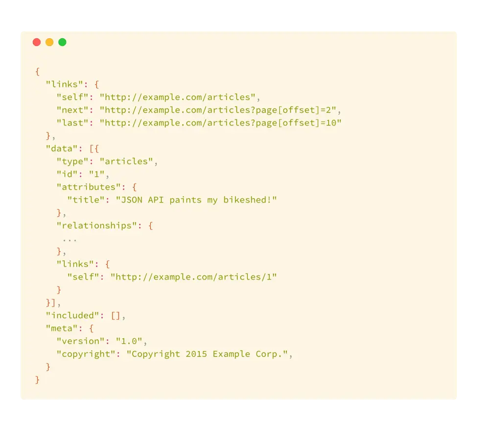 同样的,这个世界上已经有人注意到这个问题,有一份叫做JSON API开源规范文档描述了如何传递数据的格式,JSON API最早来源于Ember Data(Ember是一个JavaScript前端框架,在框架中定义了一个通用的数据格式,后来被广泛认可)。