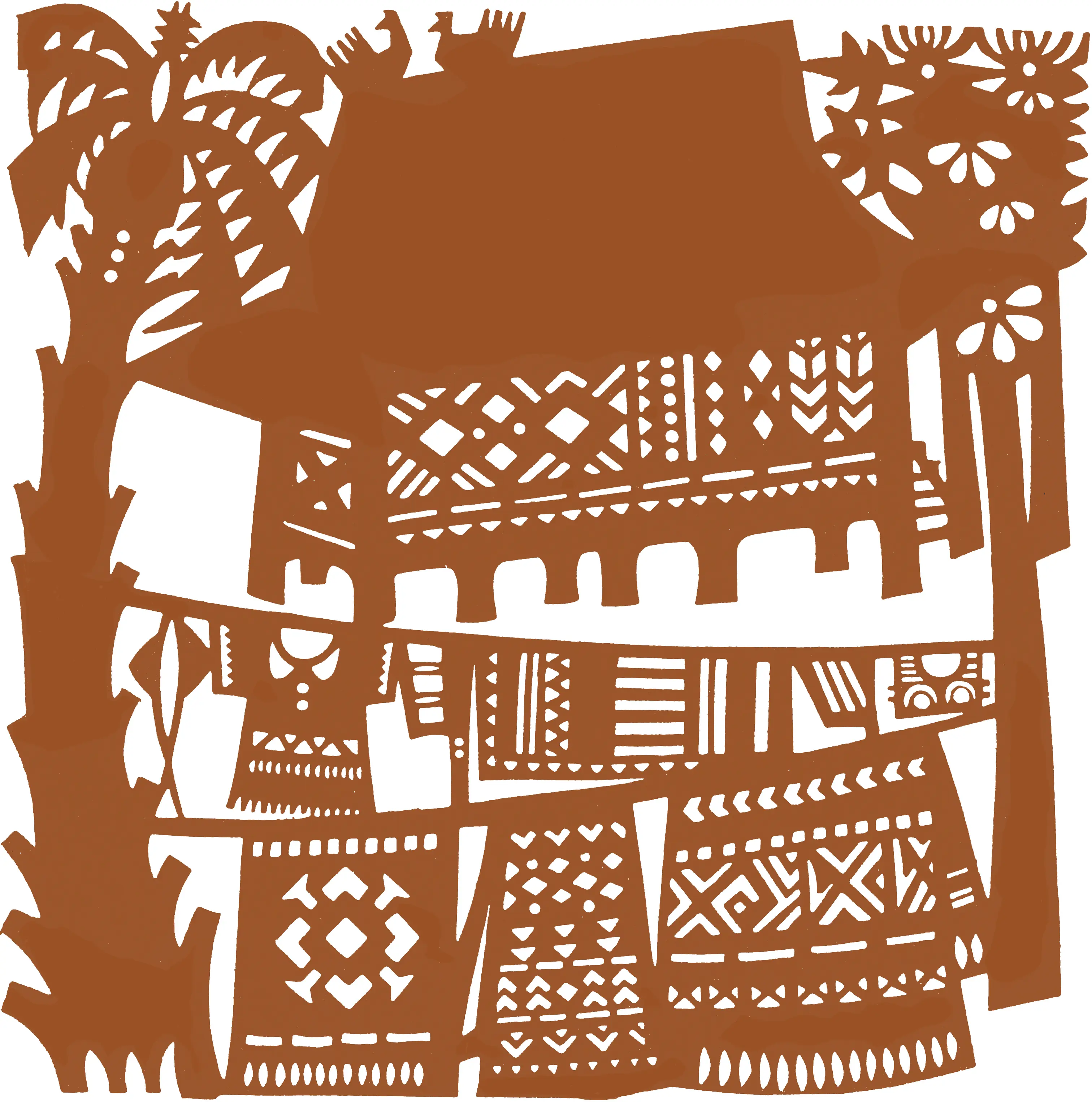 云南24个民族,风俗各异、丰富多彩,加之地理环境与人文因素形成了千姿百态的景观。云南画派取材于此,四人剪展也以此为主题,“共饮一江水”共同享受地域特色的营养和滋润。在他们的画面上,亚热带风光形成的奇特壮丽的景色带动着画笔和刻刀,小桥、流水、竹楼、大青树、奇异的高峰牛、婀娜的傣族少女、多姿的仙人掌、挺拔的椰子树......亚热带多姿多彩奇异风光的景色,是云南画派和四人剪展共同的题材。