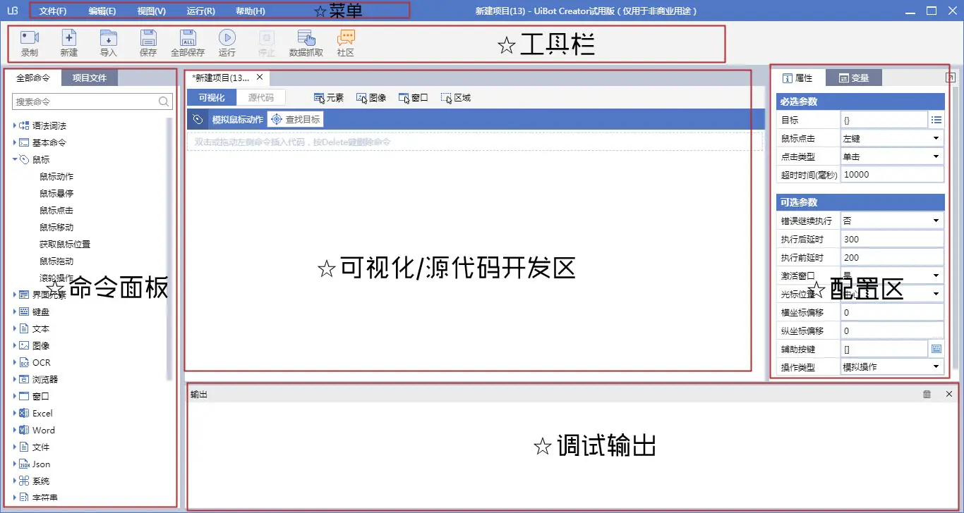 UiBotCreator v1.0最突出的特点 当属它的易用性 这也是我们始终所关注的问题。 ●简洁的版面,直观明了。 ●全中文设计,更加利于用户操作与使用。 ●简单的录制工具,使得软件上手无难度。 ●快捷的数据抓取,全面提升用户使用效率。 ●源码视图和可视化视图一一对应,并可相互转换,对于想要进一步深入探索UiBot的用户,提供了极大的便利与支持,降低用户进阶门槛。 最重要的是