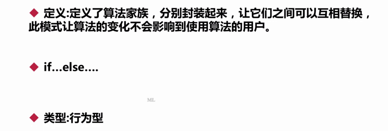 - 定义 Define a family of algorithms,encapsulate each one,and make them interchangeable. 定义一组算法,将每个算法都封装起来,并且使它们之间可以互换.