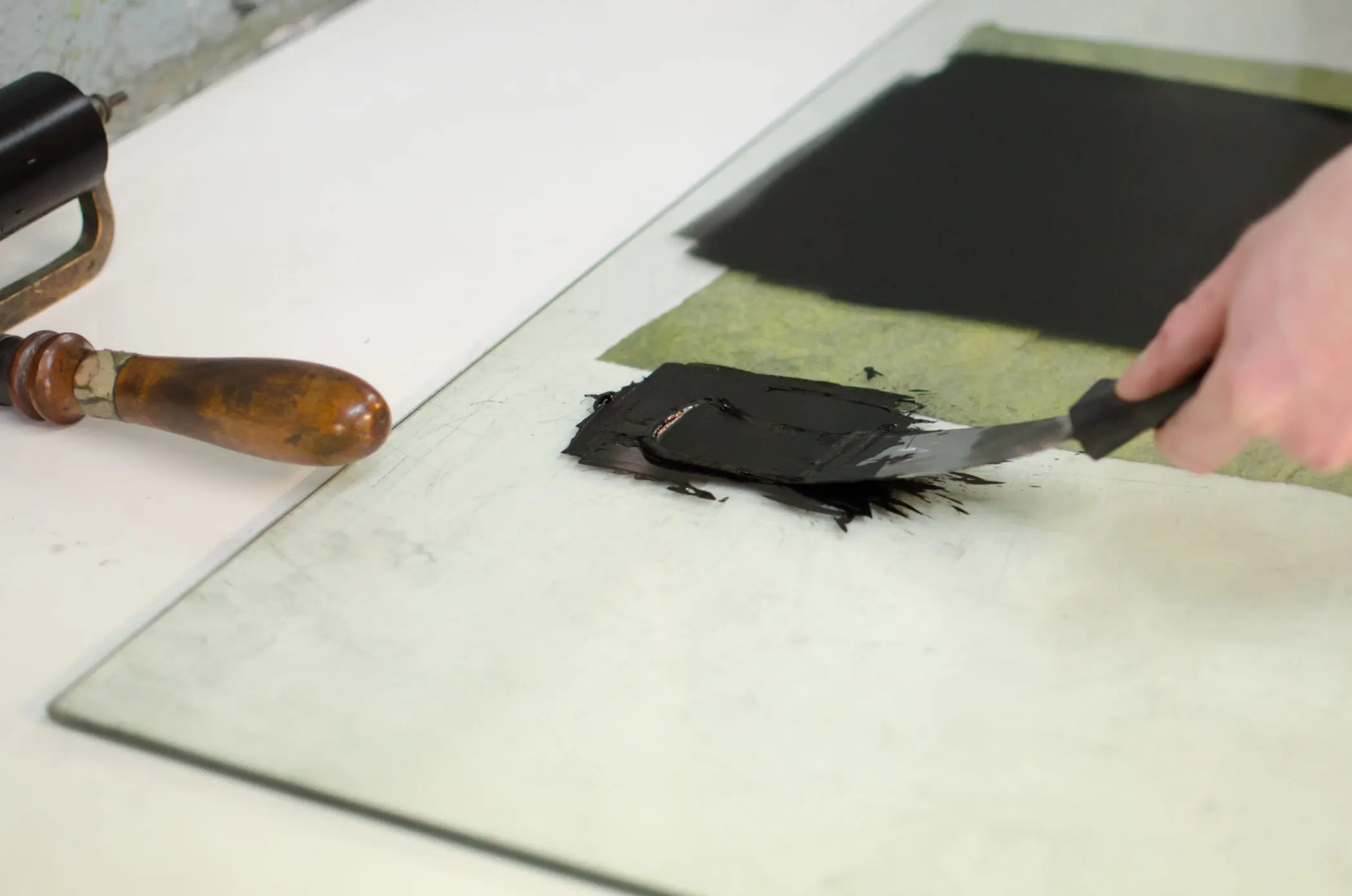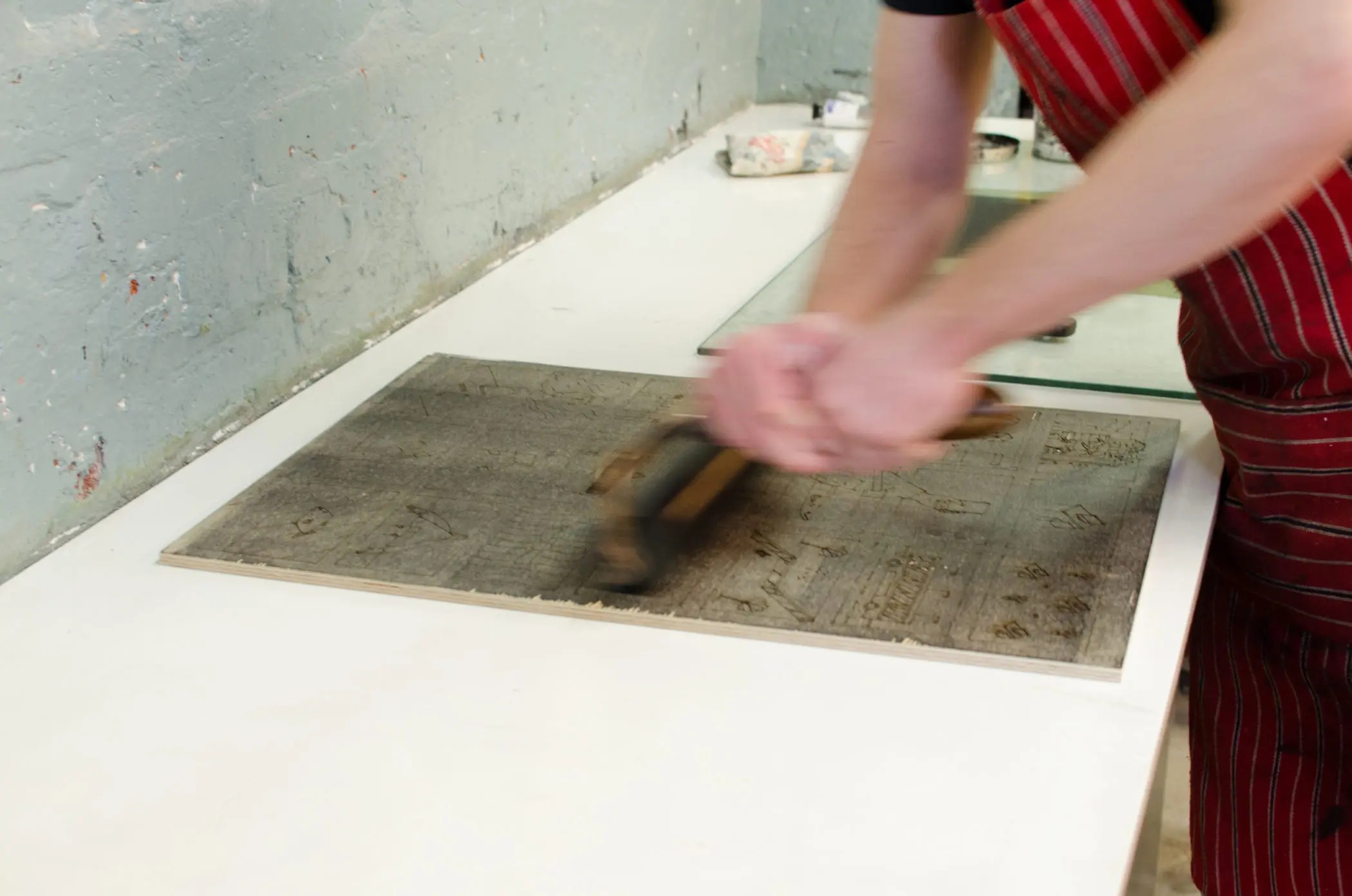 印刷巨型木版也是我们Slaughterhaus朋友们的一大要求。他们以前从来没有打过这么大的木版,并且需要一些试验和错误才能在整个区块内获得均匀的压力,以便为我们提供统一的印刷。