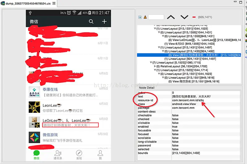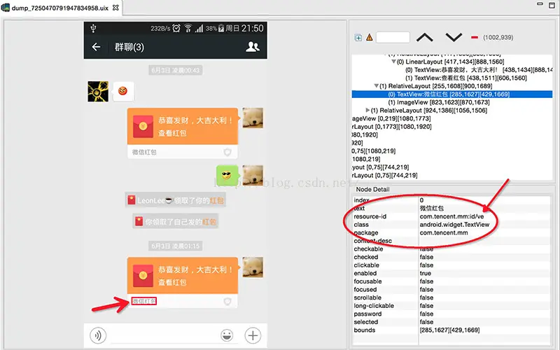 这里我们在查找包含有:拆红包 的文本内容的节点View,然后模拟点击