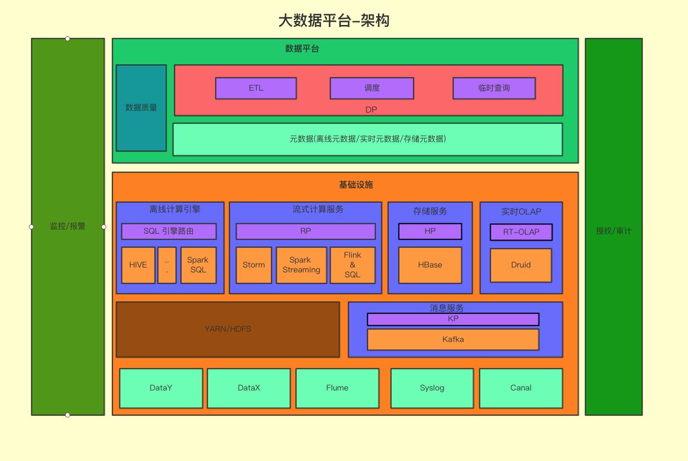 第三层是数据平台部分,数据平台是直接面对数据开发者的,包括几部分的功能,数据开发平台,包括日常使用的调度,数据传输,数据质量系统;数据查询平台,包括ad-hoc查询以及元数据查询。有关有赞数据平台的详细介绍可以参考往期有赞数据平台的博客内容。