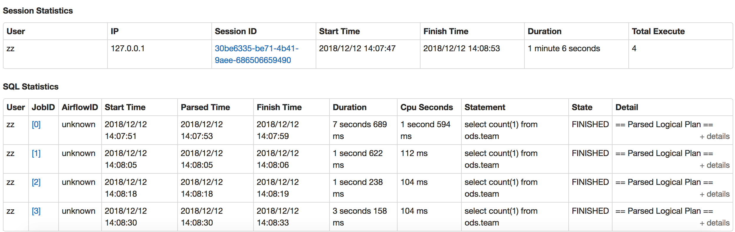 SparkSQL 需要收集 STS 上执行的 SQL 的审计信息,包括提交者执行的具体 SQL,开始结束时间,执行完成状态。原生 STS 会把这些信息通过事件的方式 post 到事件总线,监听者角色 (HiveThriftServer2Listener) 在事件总线上注册,订阅消费事件,但是这个监听者只负责 Spark UI 的 JDBC Tab 上的展示,我们改造了 SparkListener 类,将 session 以及执行的 sql statement 级别的消息也放到了总线上,监听者可以在总线上注册,以便消费这些审计信息,并且增加了一些我们感兴趣的维度,如使用的 cpu 资源,归属的工作流(airflowId)。同时,我们增加了一种新的完成状态 cancelled,以方便区分是用户主动取消的任务。
