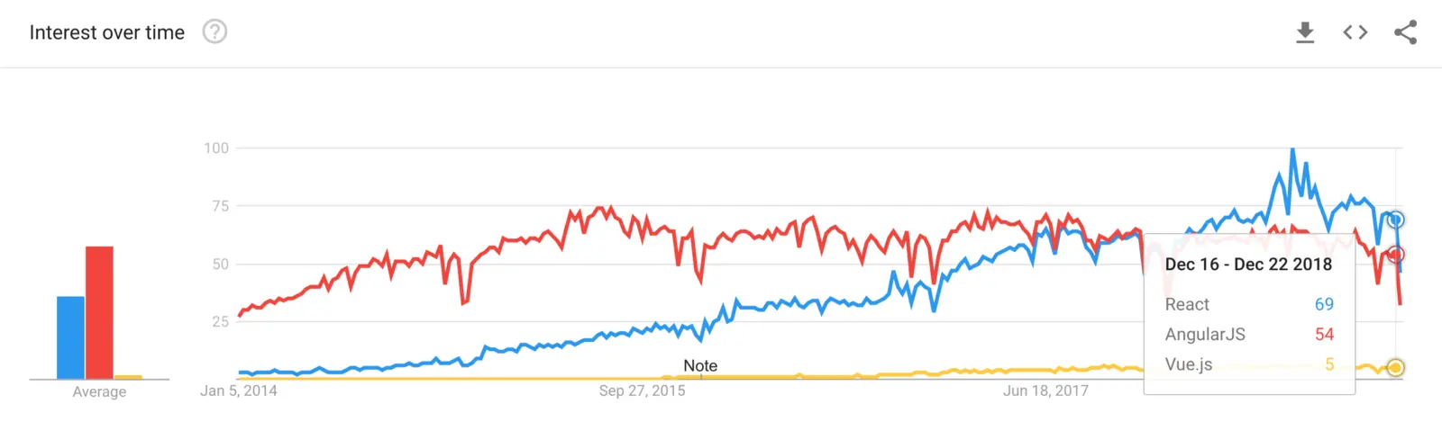 可以看到,在 2018 年之前,还是 Angular 的搜索更多,但 2018 年 React 迎头赶上,并在年末维持着优势。Vue 在图上大致是可见的状态,不过目前仍然是占据较低的比例。作为对比,下面是去年的统计图: