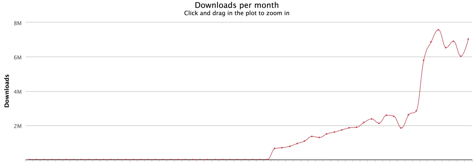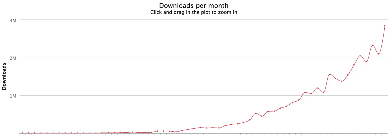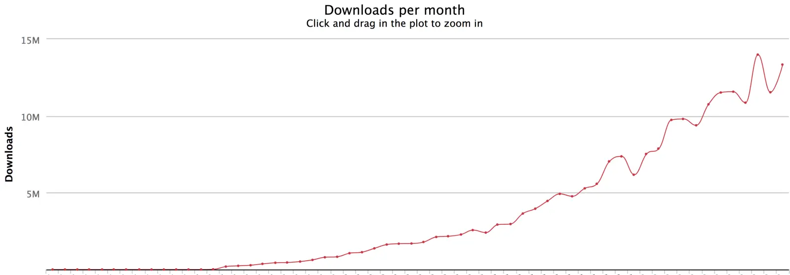 包下载量可以更为清晰的展示出他们的实际使用。下面是三个框架从 2014 年至 2018 年的情况: