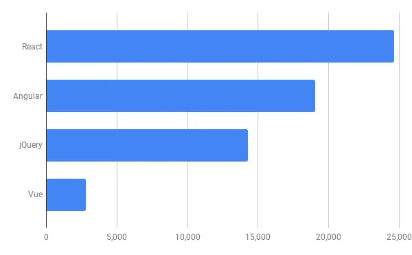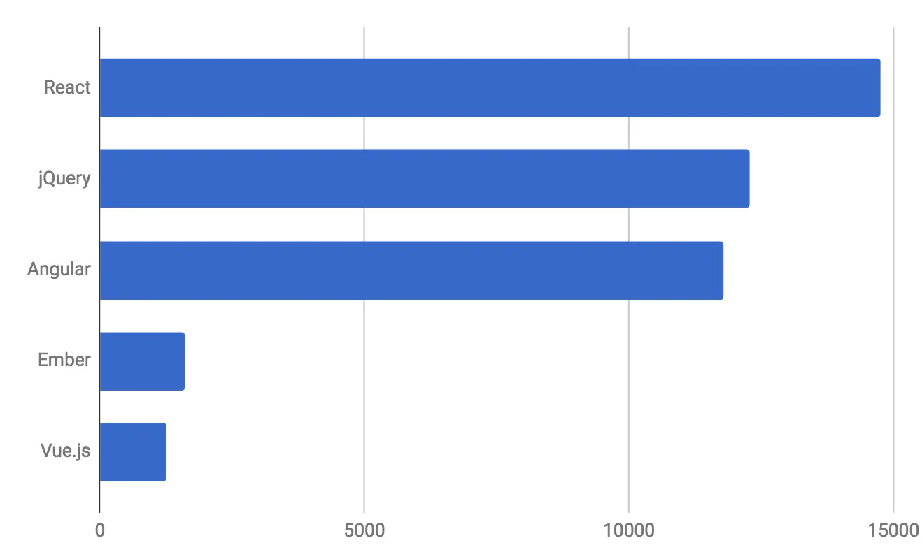 jQuery 和 Ember 并没有增加太多,但其他三个仍然在增加,也算是某种程度的下滑了。下图是去年的统计,可以看出,jQuery 的排名依据被 Angular 超过了:
