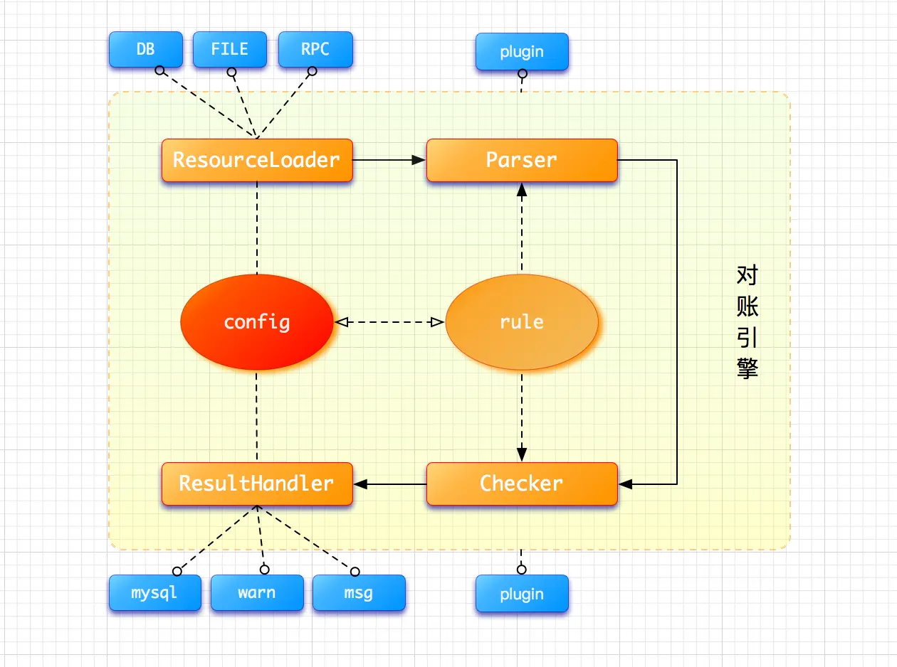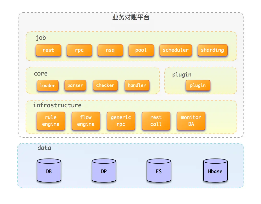 整体上主要采用调度层+对账引擎(core+plugin)+基础设施的分层架构。调度层主要负责任务触发、任务拆分、调度;对账引擎则负责执行可编排的对账流程;基础设置层则提供规则引擎、流程引擎、泛化调用、监控等基础能力。