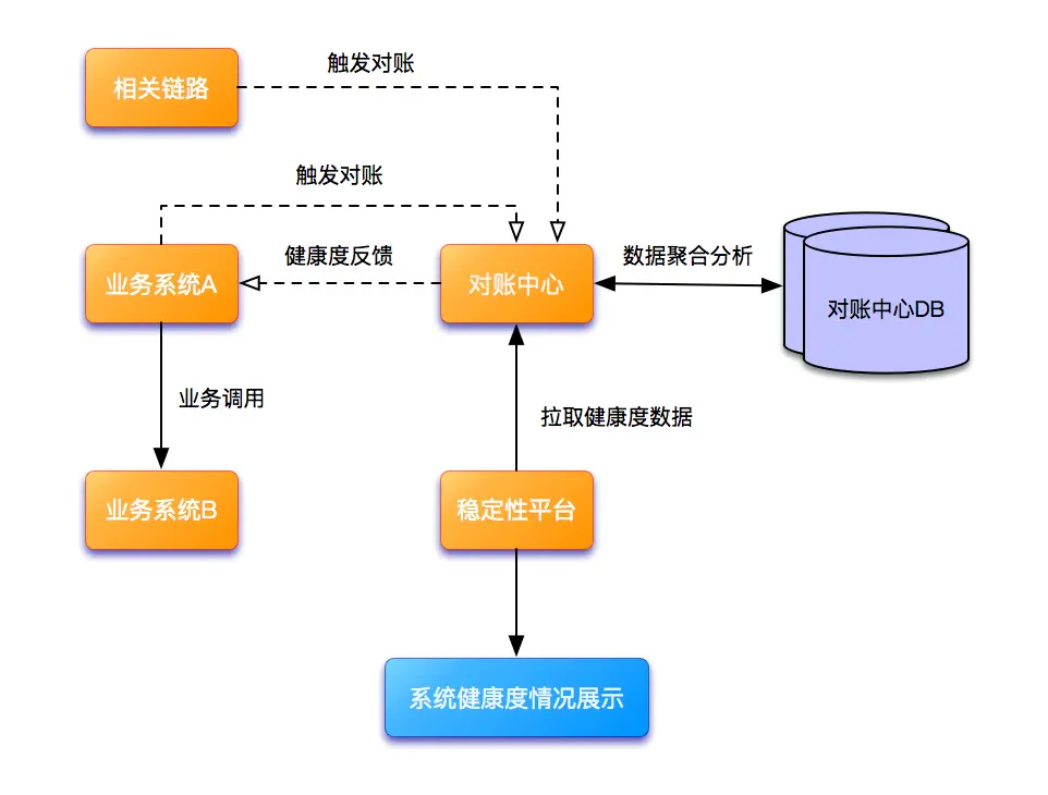 对账中心可以拿到业务系统及其所在整个链路的数据一致性信息。基于此,对账平台具备了给予业务系统和链路健康度反馈的能力。