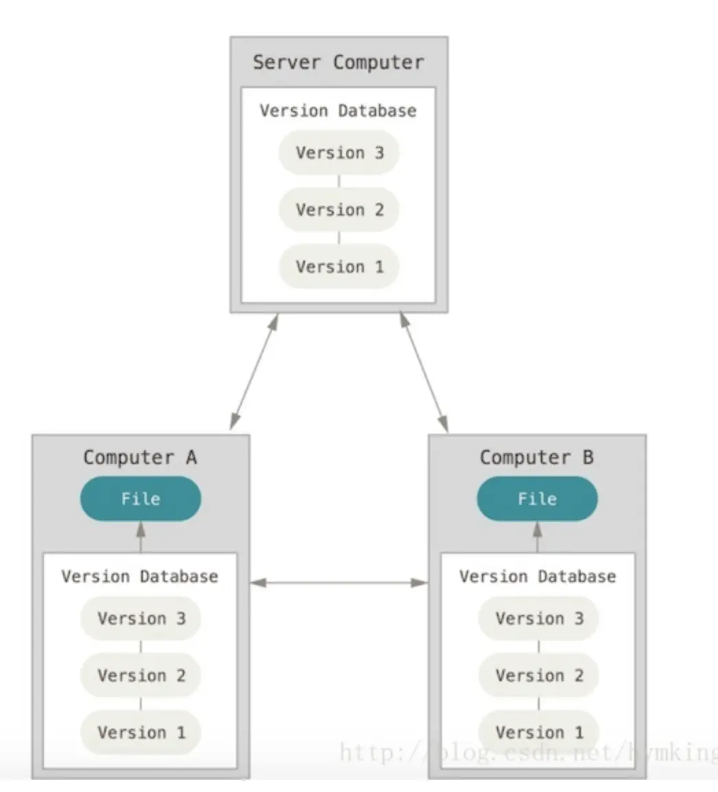 ③分布式版本控制:(git是这种形式,GIT跟SVN一样有自己的集中式版本库或服务器)