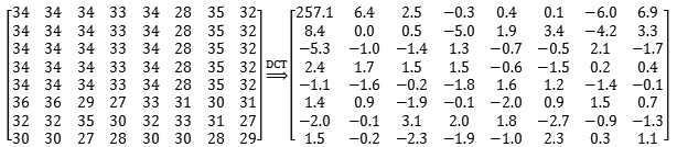 将图像矩阵分割成一块块8X8单位,每个单位单独用后面4个步骤处理,使用8X8尺寸进行分割的原因是:图像本身的连贯性,一个8X8的图像中的数值一般不会出现大的跳跃。