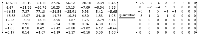 JPEG数据量化呢,会有个量化系数矩阵,用上一步DCT转化得来的图像矩阵除以量化系数矩阵,得到新的矩阵,然后用round函数四舍五入处理矩阵后,一大部分数据变成0,实现数据量化压缩。算法详情入口