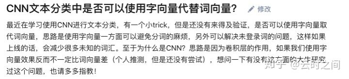 自己的思路原本是使用CNN+字向量解决分类问题.然后通过选择卷积的宽度来去减少参数的规模,从而提升分类效果.