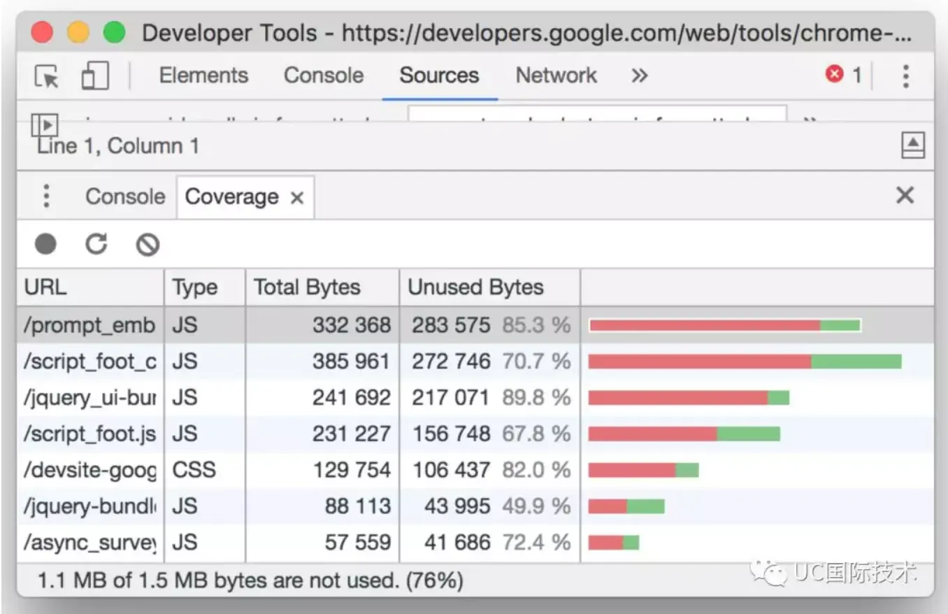 DevTools 中的 Coverage 选项卡可显示应用中有多少未使用的 CSS 和 JS 代码。