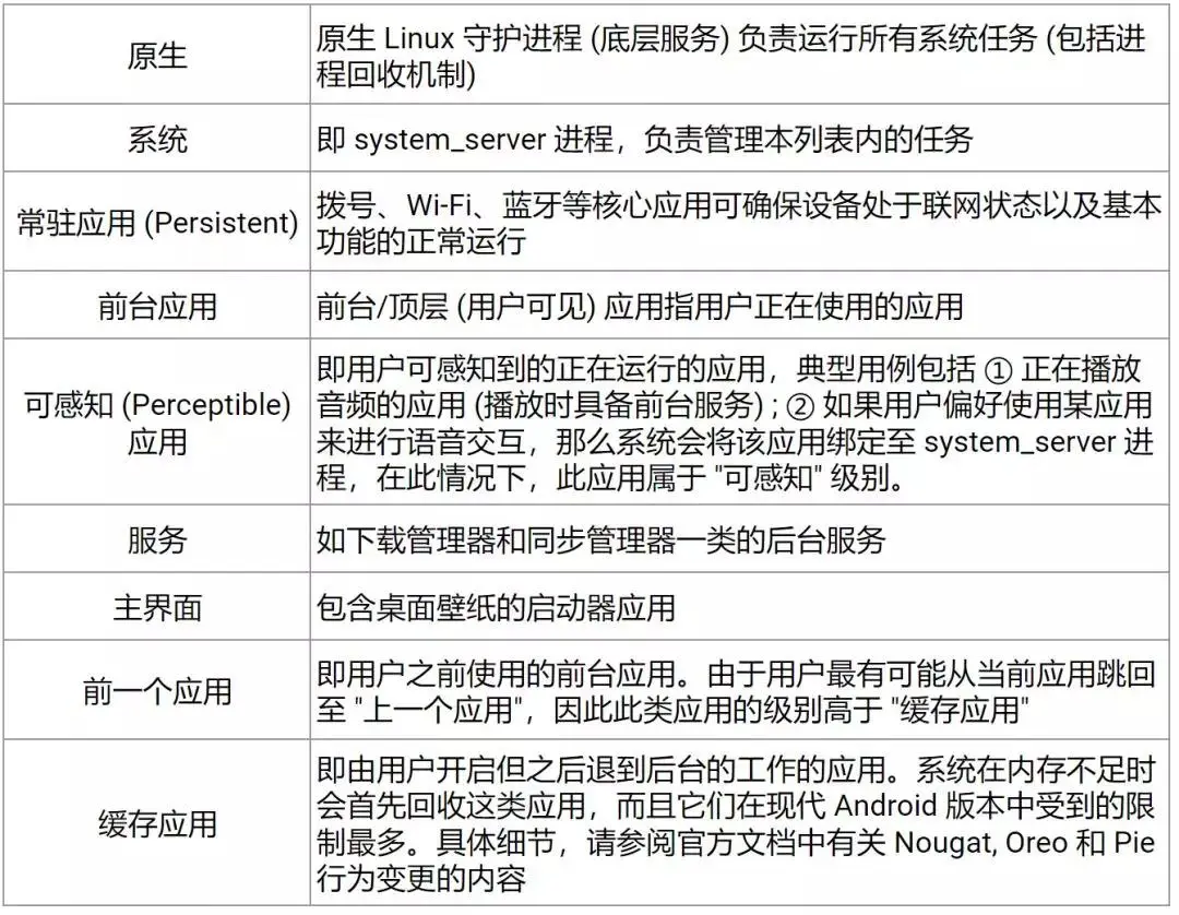 作为一款移动端操作系统,Android 在设计之初就考虑到了诸如内存和电量一类的资源限制问题。因此,系统在内存吃紧的情况下会关闭部分进程,以此来为优先级更高的任务腾出运行空间。那么系统是如何评判优先级高低的呢?判断标准其实很简单,关键就在于应用进程对用户有多重要。Android 将进程分为以下几类,按重要性的高低做降序排列,进程排名越靠前,被回收的几率就越低。