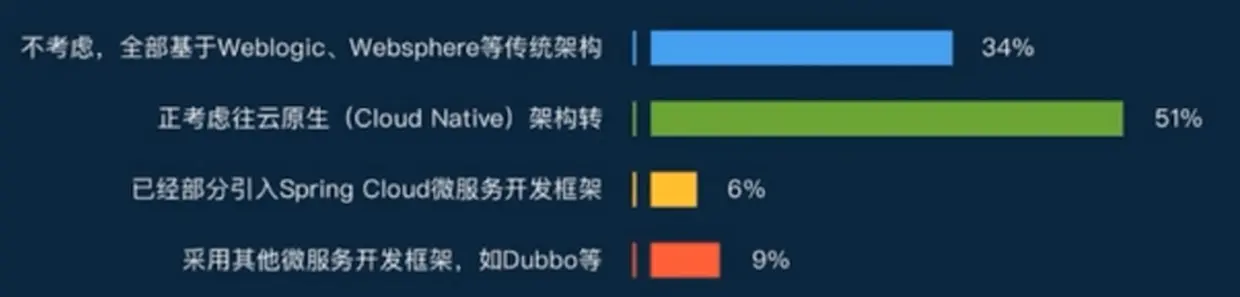 6%的企业应用了spring cloud开发框架,9%采用了dobbo和其他的微服务框架,51%考虑云原生的架构方向转型(公有云,私有云),因此可以看出来绝对部分企业有转型的需求的。