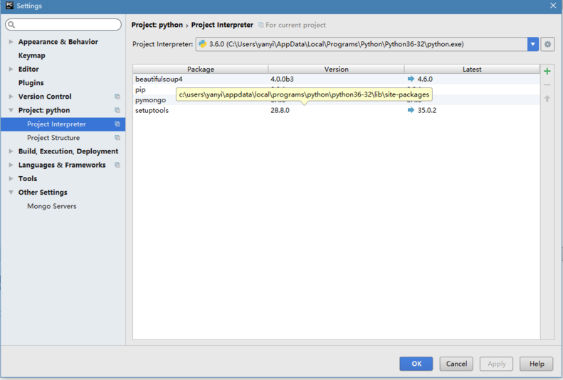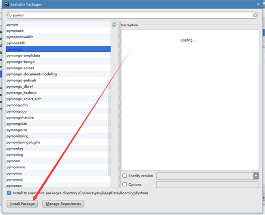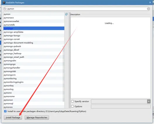 到了上面这一步,应该可以看到一个库的列表,里面列举着一些你常用的已安装库。接下来点击,右侧的一个绿色加号。打开一个Available Packages的窗口,搜索关键字pymongo。找到相关的库,选中,然后点击窗口最左下方的install package安装即可。