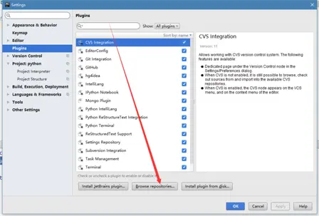 接下来点击下方3个按钮中间按钮,Browse repositories...按钮,打开所有插件列表。搜索mongo,选择Mongo Plugin插件,点击右侧窗口安装即可。