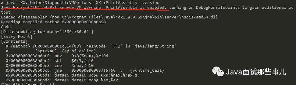 运行时,添加参数 -XX:+PrintAssembly。