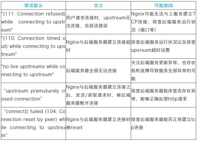 Nginx内部实现了对请求处理错误的详细记录,并保存在error.log文件中。错误类型有很多种,我们主要针对关键的、能体现服务端异常的错误进行采集并监控,以协助我们进行故障定位: