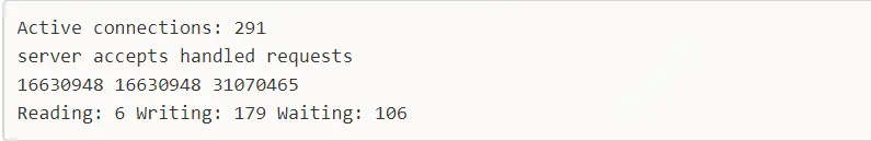 Nginx可以接受的最大连接数在配置文件nginx.conf中由worker_processes和worker_connections 两个参数的乘积决定;通过Nginx自带的模块http_stub_status_module 可以对Nginx的实时运行信息进行监控: