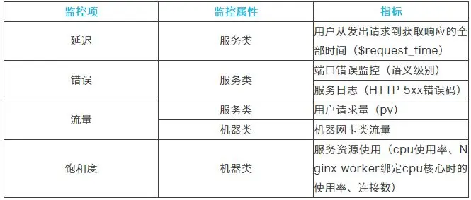 从延迟、错误、流量以及饱和度四个指标对Nginx监控实践进行说明。