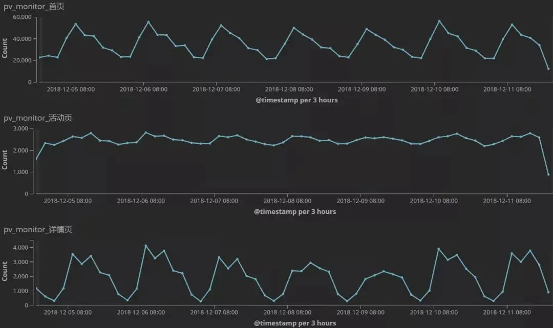 流量存在明显低峰和高峰并有天级别的周期性,基于网站运行特性,根据低峰、高峰的值来监控网站流量的波动,并通过自身的监控仪表盘配置网站关键页面的流量图,以协助故障排查: