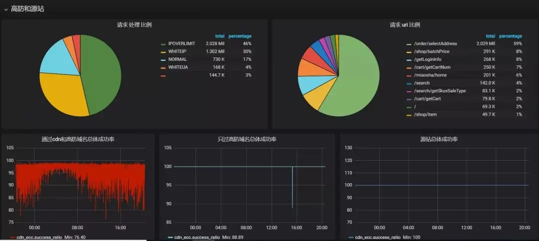 解决:订单监控及Nginx的PV、请求时间等监控指标发出报警后,运维人员迅速通过自建的ELK监控仪表盘,关注网站流量变化,查看用户请求top IP、top URL;发现存在大量黄牛的恶意抢购行为,导致服务后端处理延时。因此,我们通过降低高防产品、Nginx限流配置中相关接口防攻击阈值,及时拦截了对系统负载造成压力的刷单行为,保障了新品促销活动顺利开展。