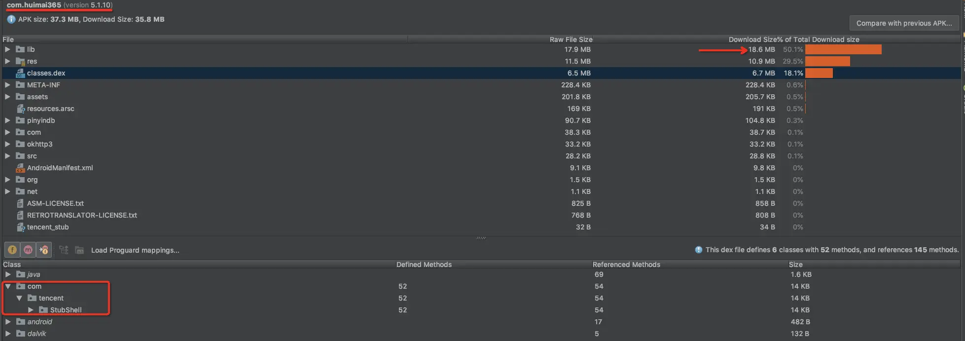 com.huimai365的包,而且lib下面的so文件竟然占比达到了50%多。心里顿时凉了半截,我擦,这是加固了呀!