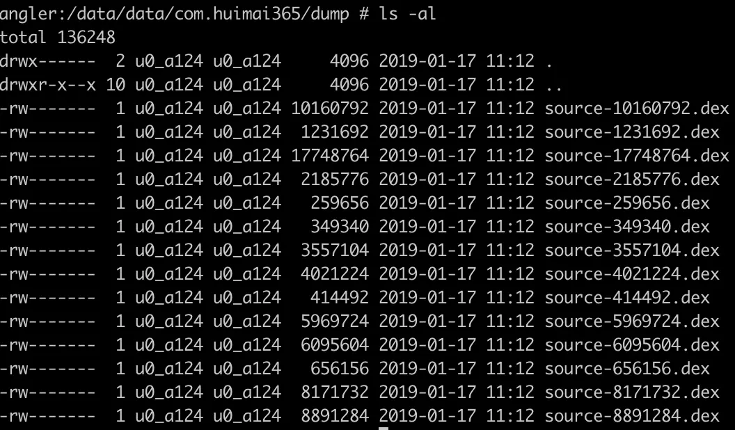 /data/data/com.huimai365/dump文件夹下发现了很多dex文件,感觉离成功又进了一步!