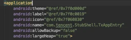 为什么明明有这个类,却ClassNotFoundError呢?去了解下加固原理,才知道原来APP加壳之后,更改了classloader,因此我们用原本的classloader是会报类无法被找到的异常的。该APP使用的是腾讯的乐固,我们看到AndroidManifest.xml里面的application已经被替换为com.tencent.StubShell.TxAppEntry