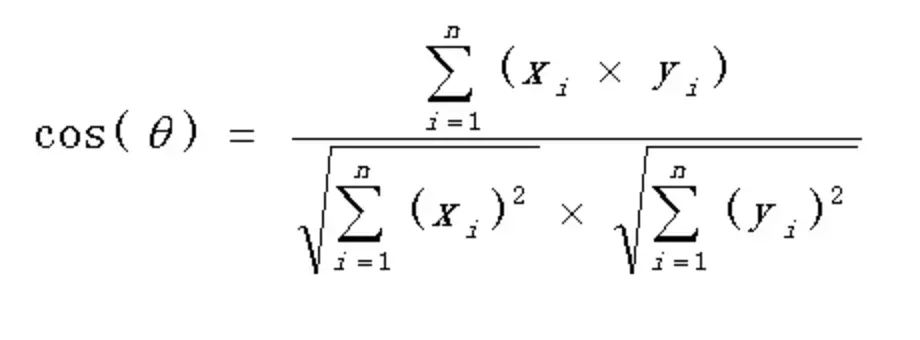 假设有向量A(x1,x2,...xn)和向量B(y1,y2,...yn),A、B 之间的余弦相似度为: