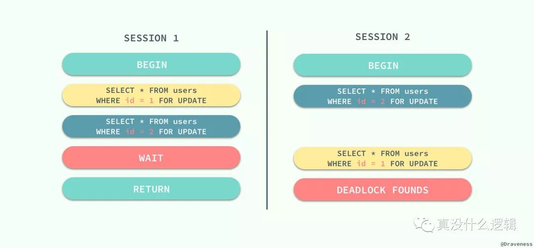 两个会话都持有一个锁,并且尝试获取对方的锁时就会发生死锁,不过 MySQL 也能在发生死锁时及时发现问题,并保证其中的一个事务能够正常工作,这对我们来说也是一个好消息。
