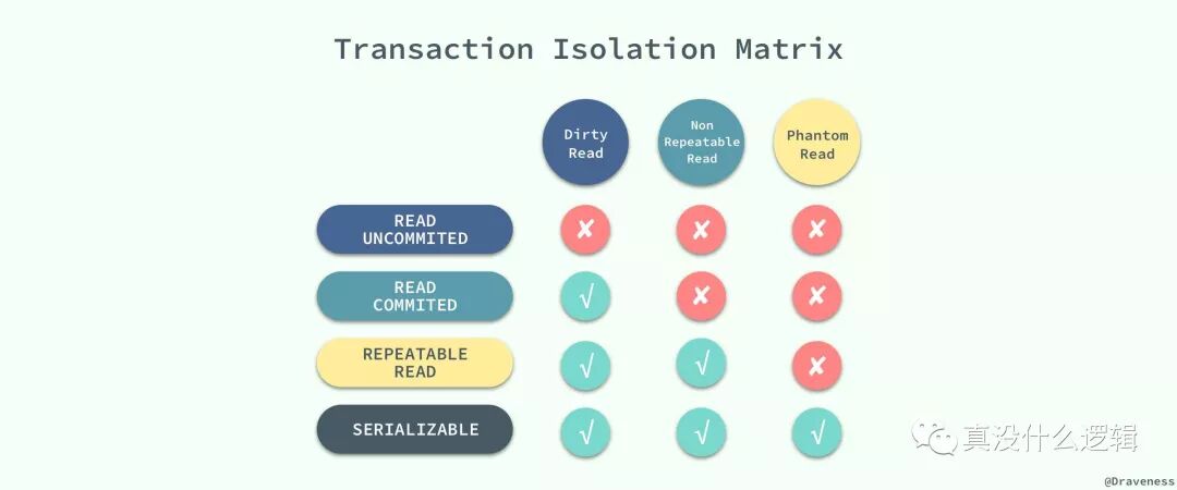 但是事务还遵循包括原子性在内的 ACID 四大特性:原子性(Atomicity)、一致性(Consistency)、隔离性(Isolation)和持久性(Durability);文章不会对这四大特性全部展开进行介绍,相信你能够通过 Google 和数据库相关的书籍轻松获得有关它们的概念,本文最后要介绍的就是事务的四种隔离级别。