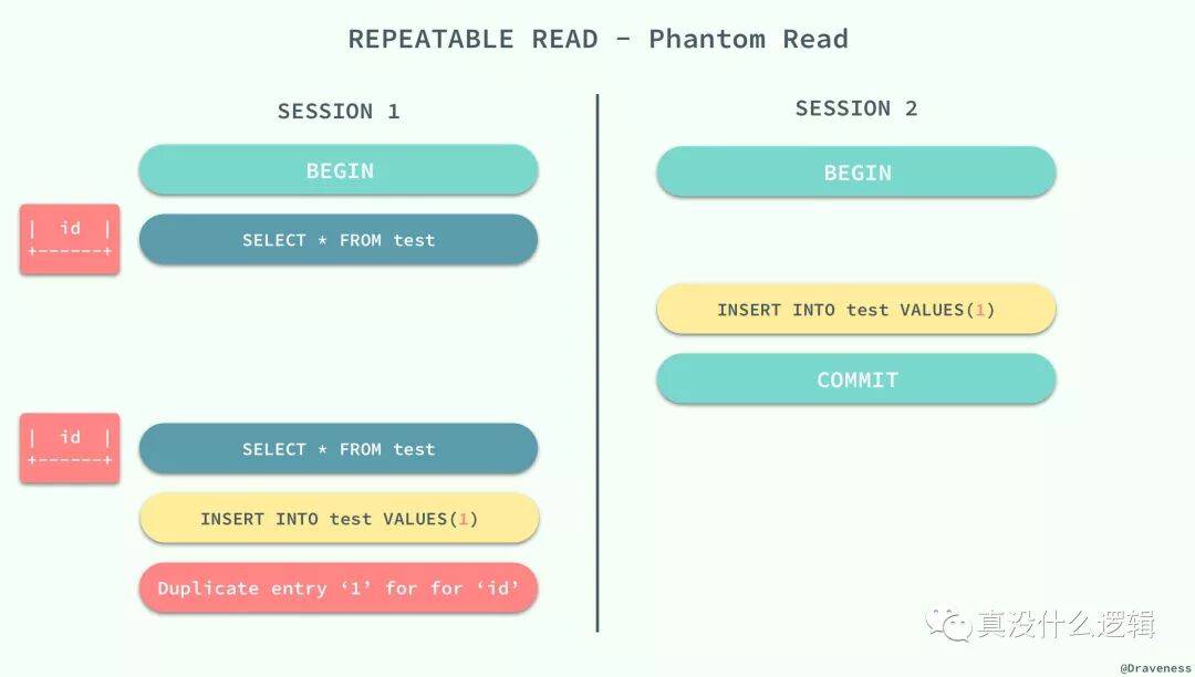 重新开启了两个会话 SESSION 1 和 SESSION 2,在 SESSION 1 中我们查询全表的信息,没有得到任何记录;在 SESSION 2 中向表中插入一条数据并提交;由于 REPEATABLE READ 的原因,再次查询全表的数据时,我们获得到的仍然是空集,但是在向表中插入同样的数据却出现了错误。
