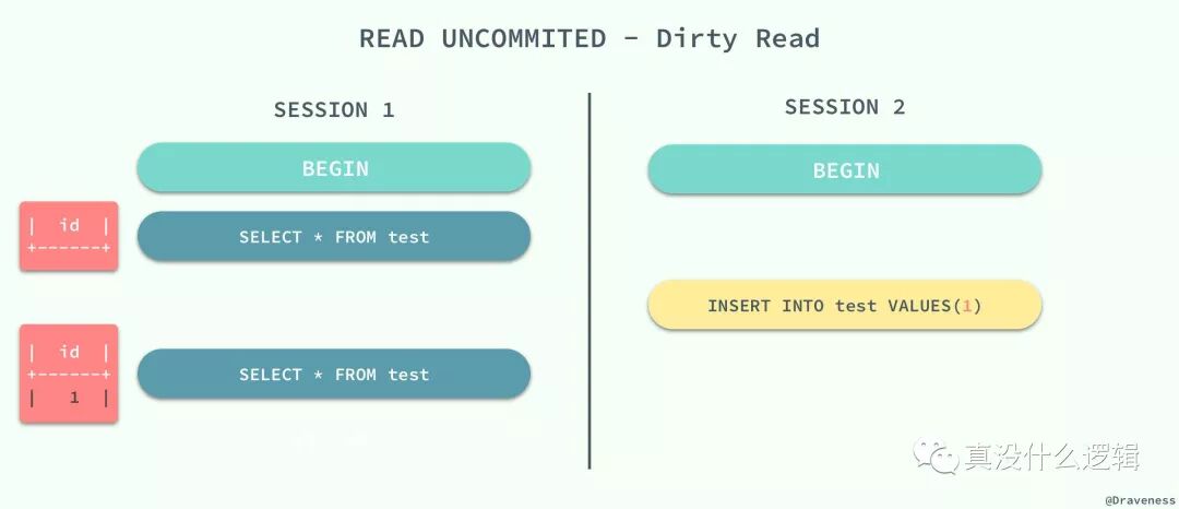 当事务的隔离级别为 READ UNCOMMITED 时,我们在 SESSION 2 中插入的未提交数据在 SESSION 1 中是可以访问的。
