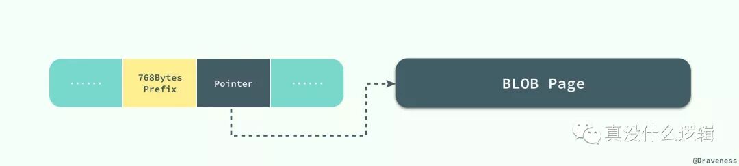 当 InnoDB 使用 Compact 或者 Redundant 格式存储极长的 VARCHAR 或者 BLOB 这类大对象时,我们并不会直接将所有的内容都存放在数据页节点中,而是将行数据中的前 768 个字节存储在数据页中,后面会通过偏移量指向溢出页。