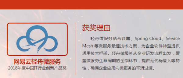 此外,给予网易云轻舟微服务颁发“2018中国IT风云榜年度优秀产品奖”的比特网和CIO俱乐部认为,网易云轻舟微服务是目前市场上最为全面的微服务平台。