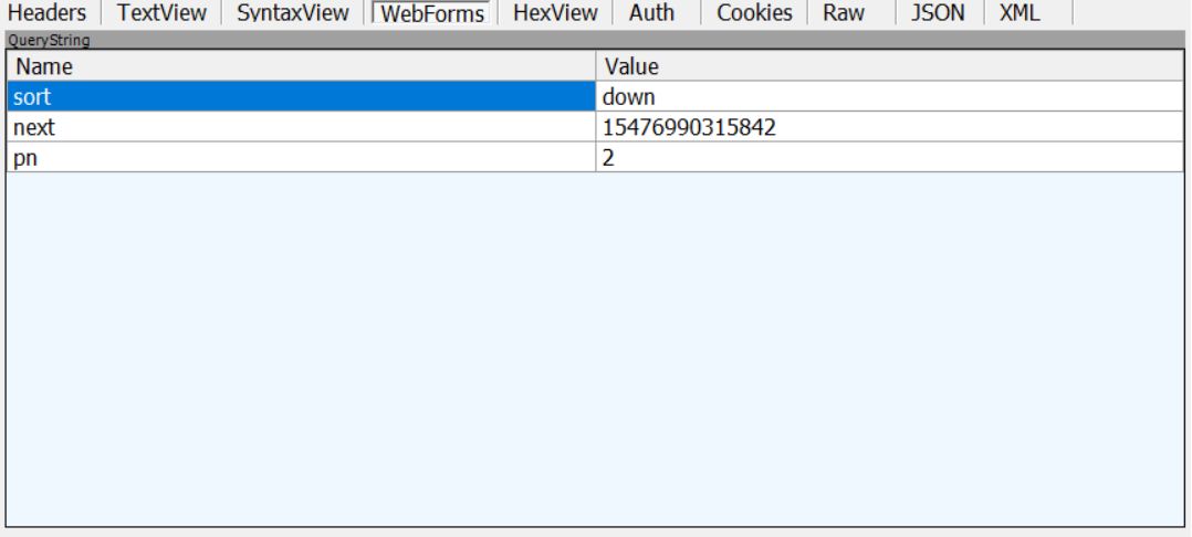 可以看到,向下翻页多了两个参数,不过容易知道,next 参数就是一个时间戳,而 pn 参数就是页数吧,从 0 开始的。
