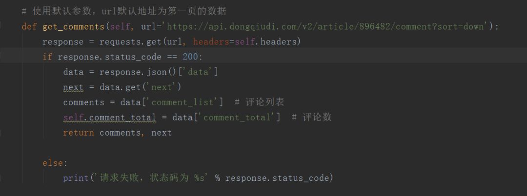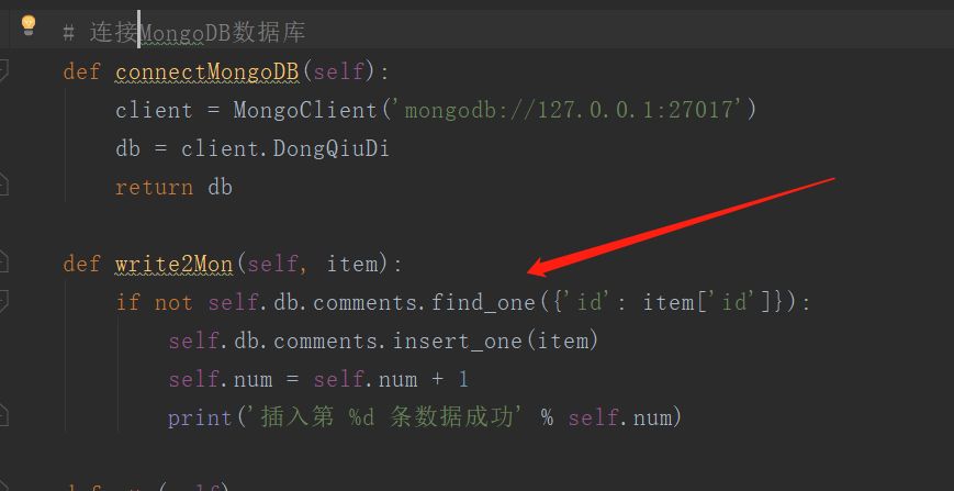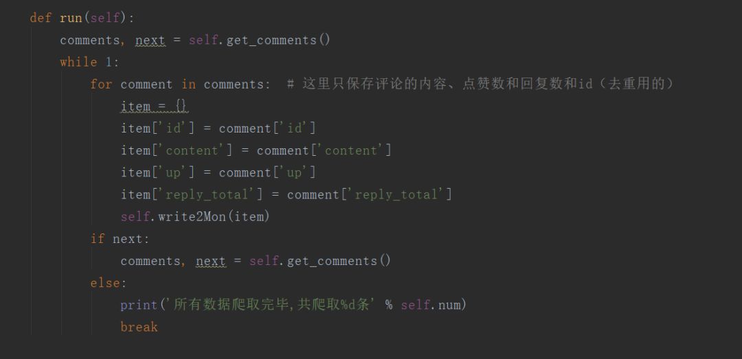 这是主体部分,先从第一个评论链接中爬取评论以及找出下一页的评论地址进而继续爬取。这里是把数据库存进 mongodb 中。
