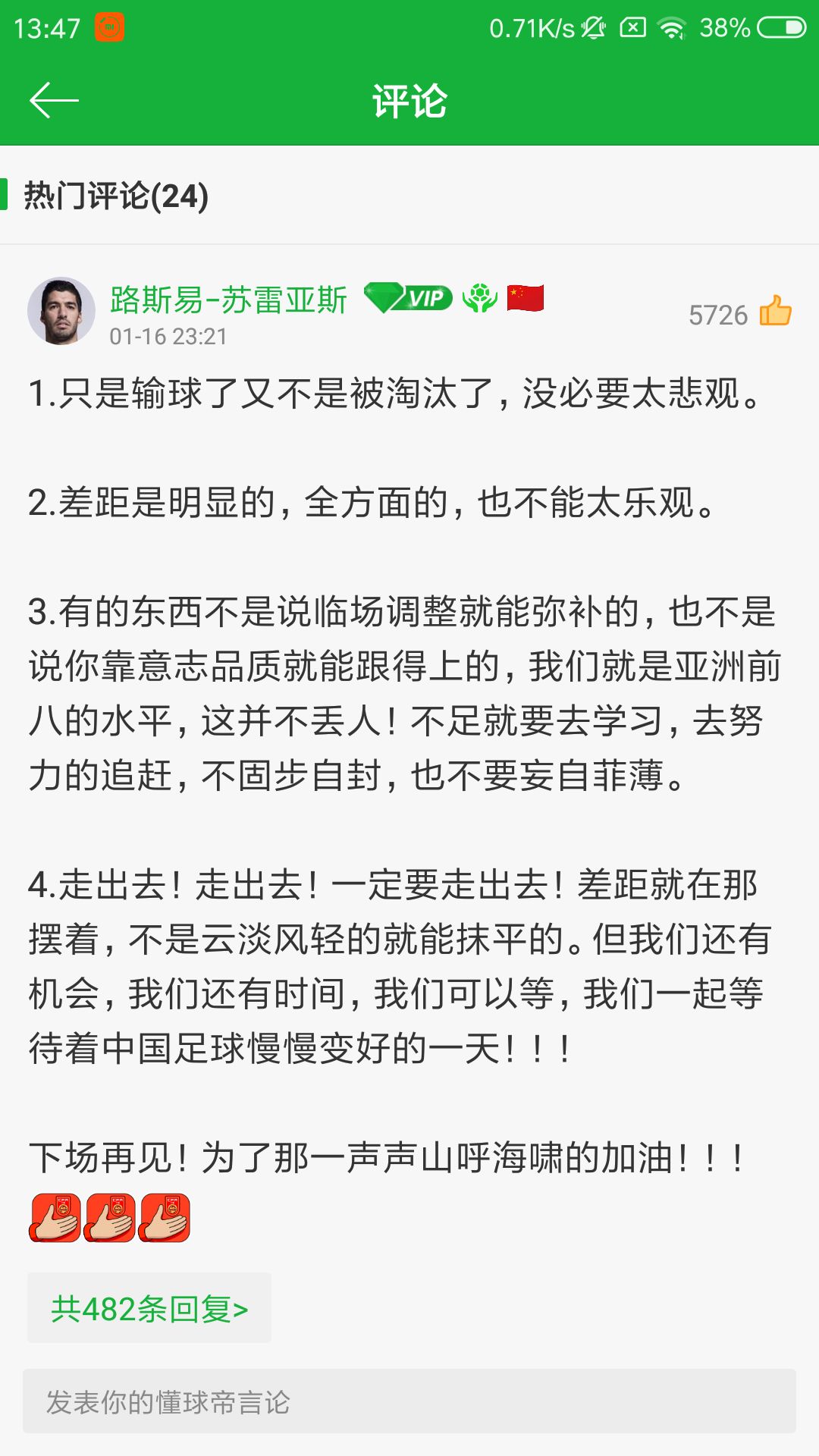 可以看出,昨晚国足输一场,也被很多人喷了,但是还是有很多人是一直支持的,永远都为国足加油,里面也说到了,中国和韩国是有一定差距的,而且还有点大,输了也正常不过了,没必要喷,再说我觉得昨晚的比赛已经比第一场的比赛好很多(第二次没看),还是有进步的,我对国足未来淘汰赛也是充满期望的,我相信能走得更远!