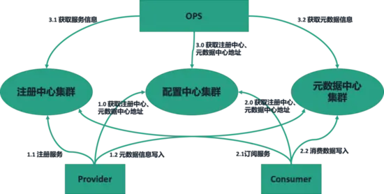 期望的使用方式:Provider 先去配置中心里获取注册中心的地址和元数据中心地址,再根据拿到的注册中心地址去对应的注册中心注册服务,根据拿到的元数据中心地址写入元数据信息到对应的元数据中心 Server。Consumer 和 OPS 也是类似的。